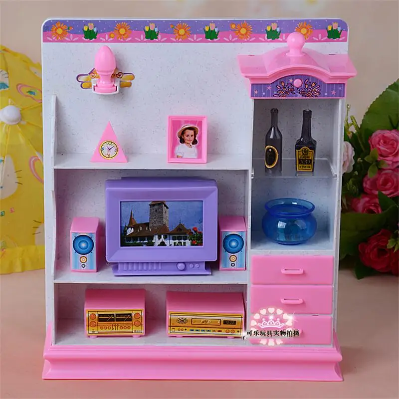 صور ل ل دمية باربي اكسسوارات أثاث دمية بلاستيكية محاكاة مع ضوء المعيشة غرفة التلفزيون خزانة مجموعة هدية جميلة فتاة DIY